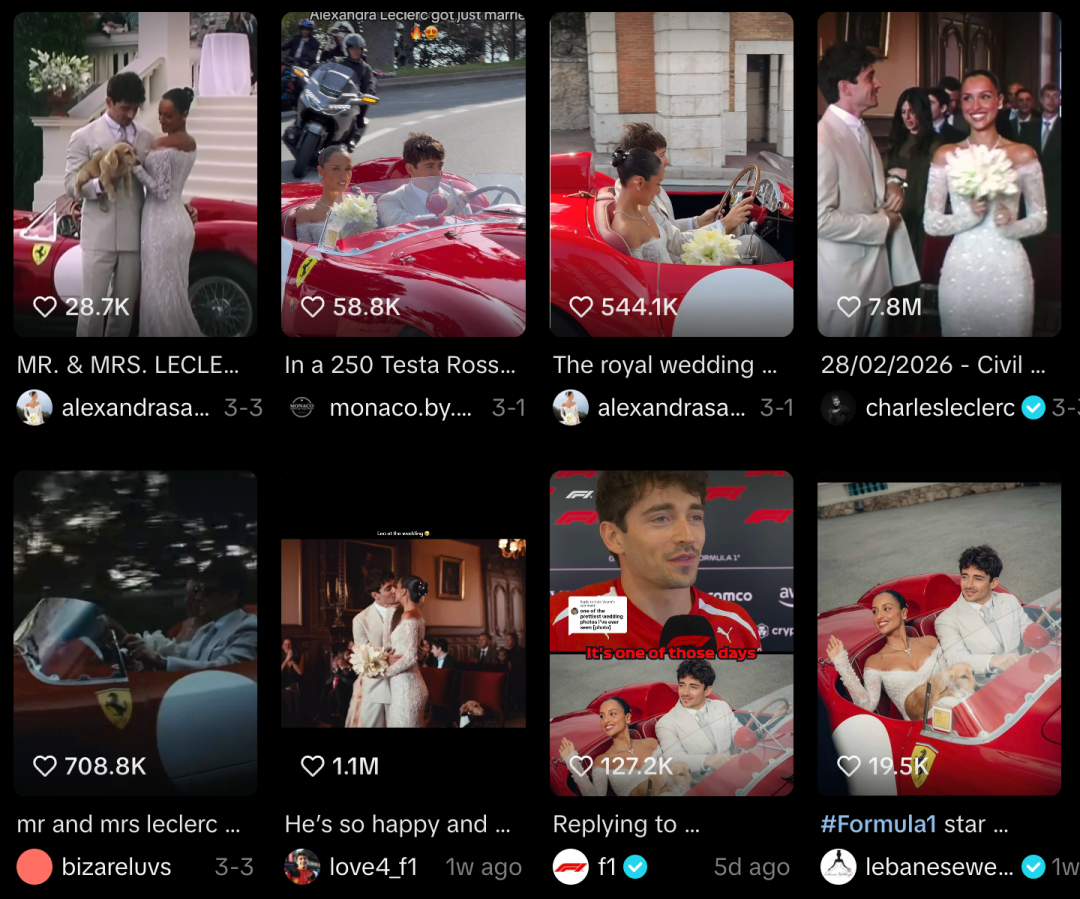 随着比赛热度被不断放大,F1 作为一个全球体育叙事的符号也在社媒之外持续发酵。查尔斯·勒克莱尔的婚礼照片就在 Ins 上刷爆互动,拥有了上万点赞。
