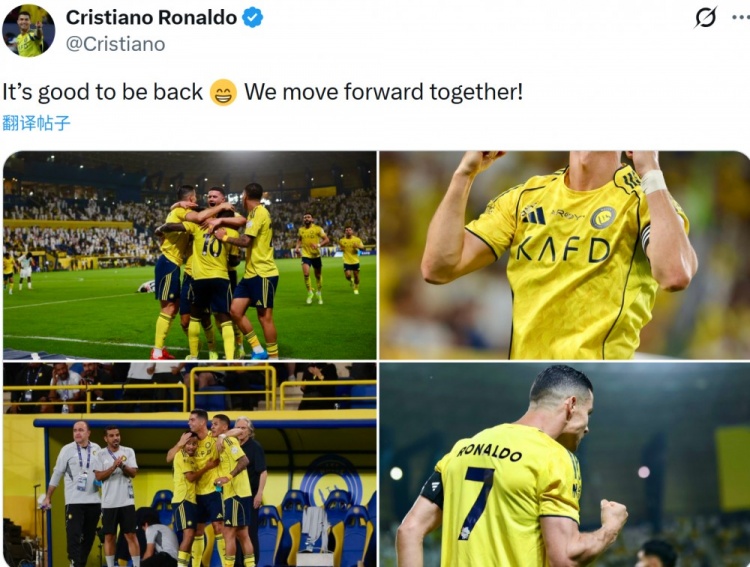 e星体育APP-重返赛场梅开二度!C罗社媒:很高兴能够复出,我们一起携手前行 xiaoqiao 2026年04月09日 18:57 19 0 4月4日讯 沙特联第27轮比赛,利雅得胜利以5-2的比分大胜纳杰马体育。本场比赛,C罗伤愈复出上演了梅开二度的好戏。赛后,C罗在社交媒体上谈论了自己的感受,他写道:很高兴能够复出,我们一起携手前行!