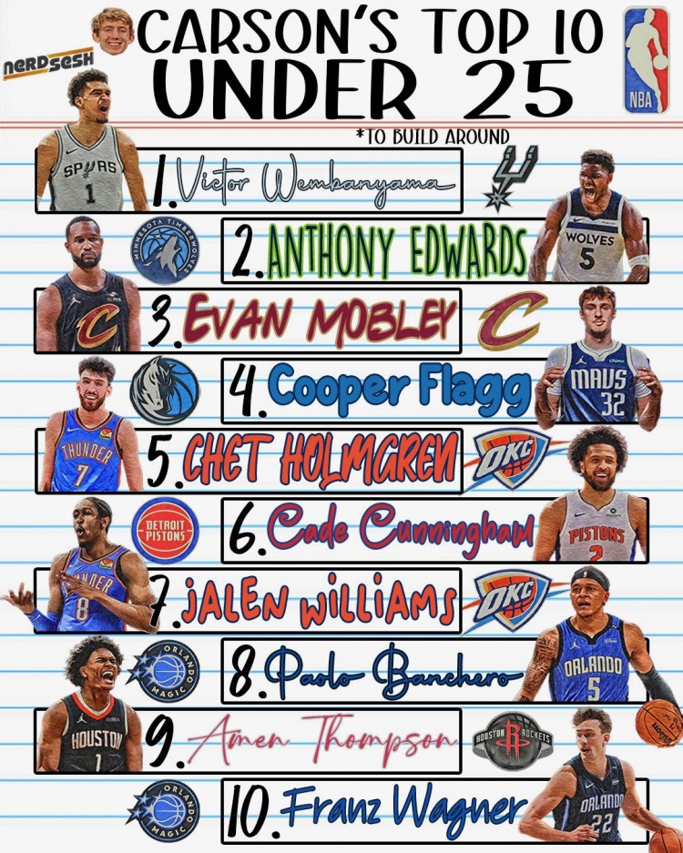 9月1日讯 近日,两名美国记者Logan Camden和Carson Breber分别评选出了自己心中25岁以下的top10球员。